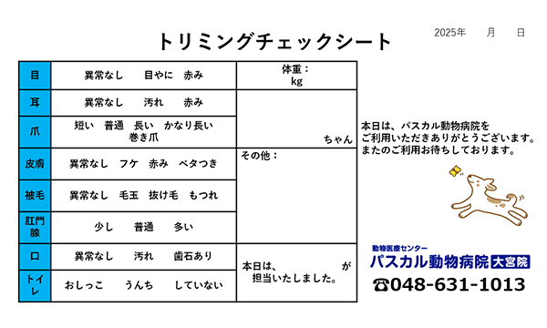 施術後には、体重や皮膚・耳の状態などをまとめた「健康チェックシート」をお渡しします。